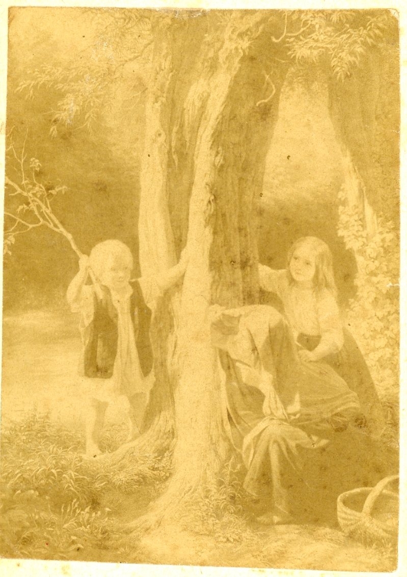 Kabinettsfotografi av ett tryck; en flicka och en pojke (med en kvist) på var sida om ett träd och en vuxen hukad under ett huckle.