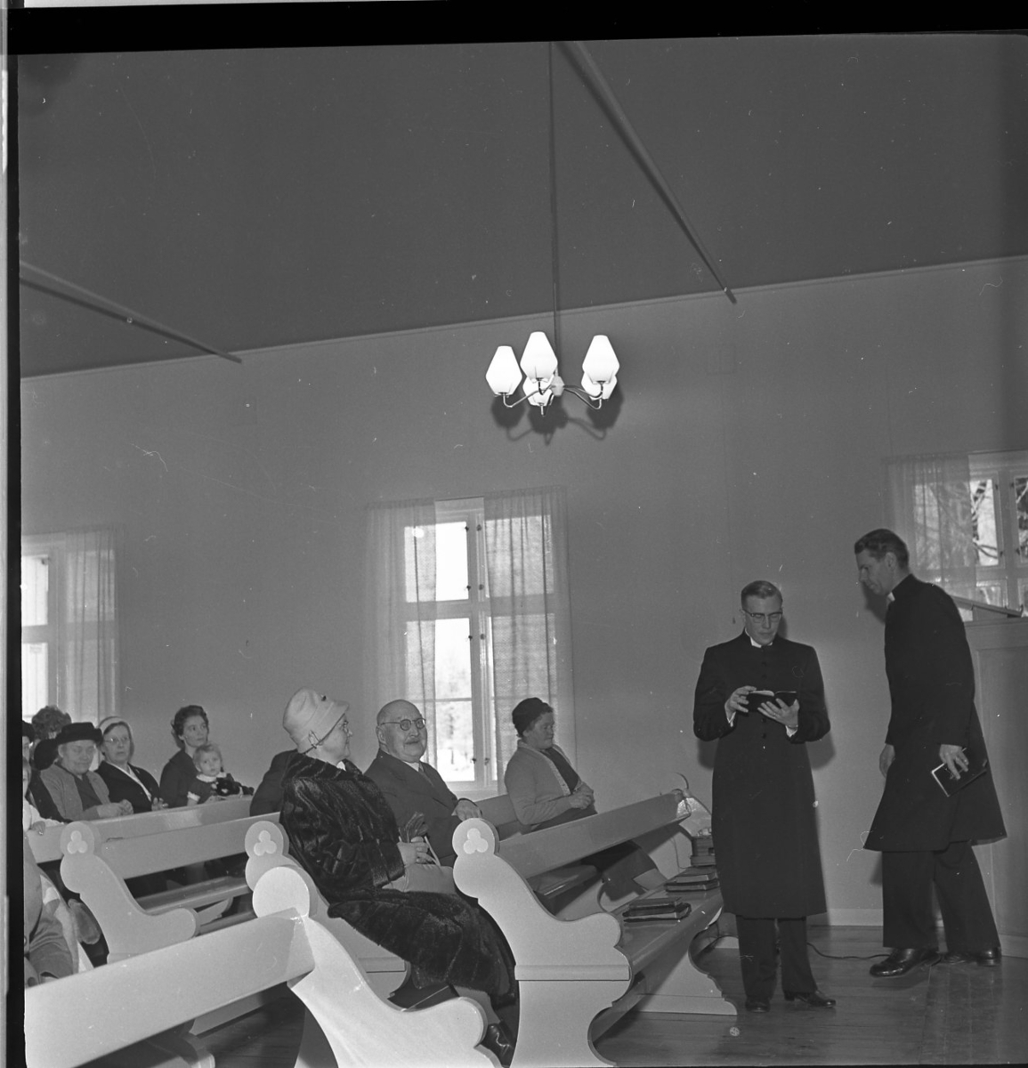 Finklädda människor sitter i bänkar. Framför bänkarna står två män med prästkrage.