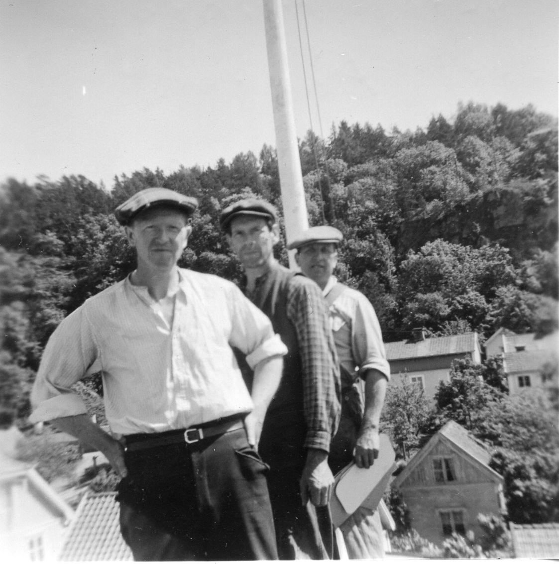 Tre män med keps står på taket till Brahegatan 3. Det är sommar.