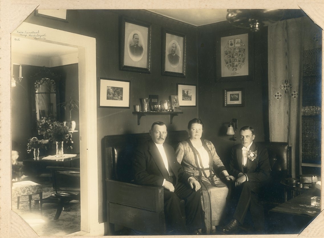 Interiör hos Thedor Andersson i Ravelsmark. En man och hans hustru sitter i en soffa. I en fåtölj till höger, nära mamman, sitter sonen. De är alla högtidsklädda. På ett bord till höger ligger en studenmössa.