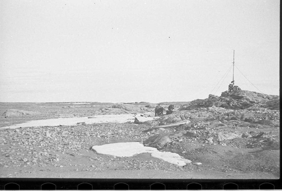 Besättningsmän från Isbjörn i arbete med utgrävning av Andréeläget på Vitön. Till höger Horns varde som markerade platsen för fyndet.