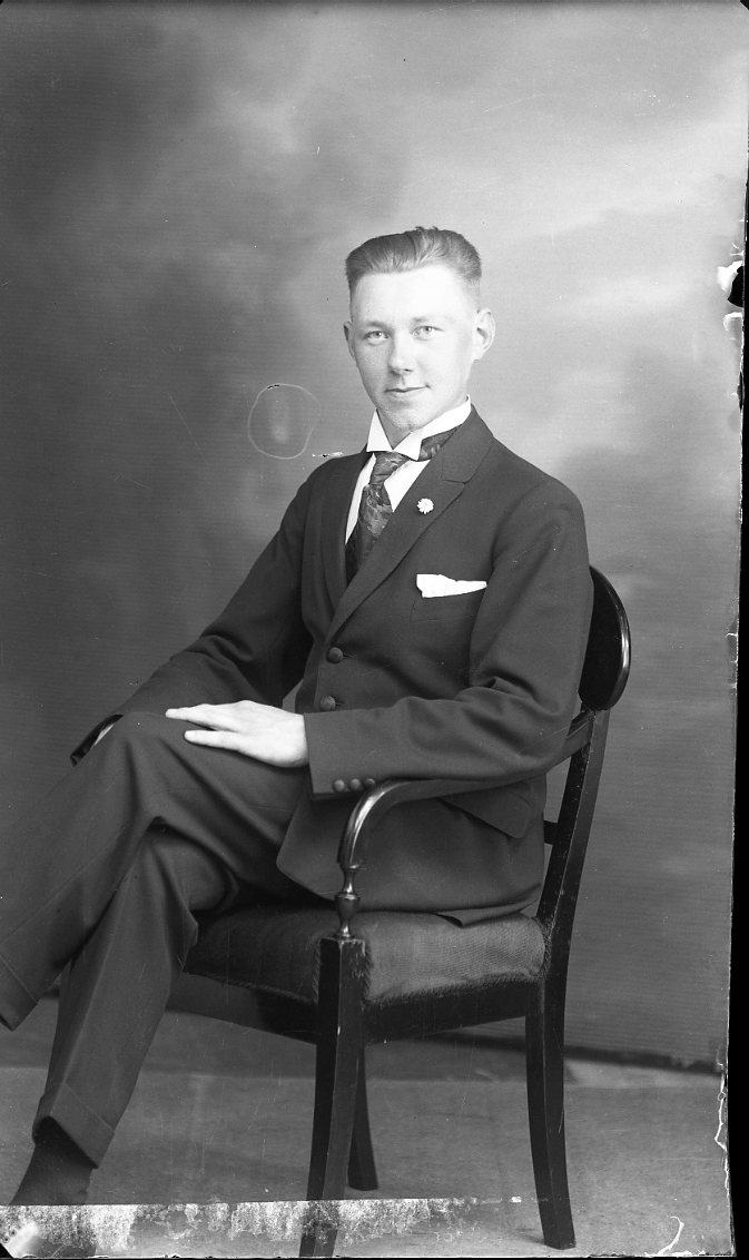 Porträtt av en ung man i kostym och slips.