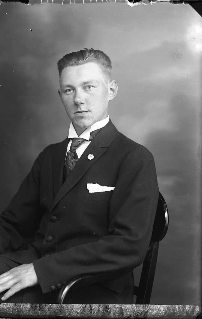 Porträtt av en ung man i kostym och slips.