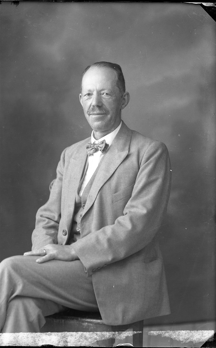 Porträtt av en man i ljus kostym och fluga.