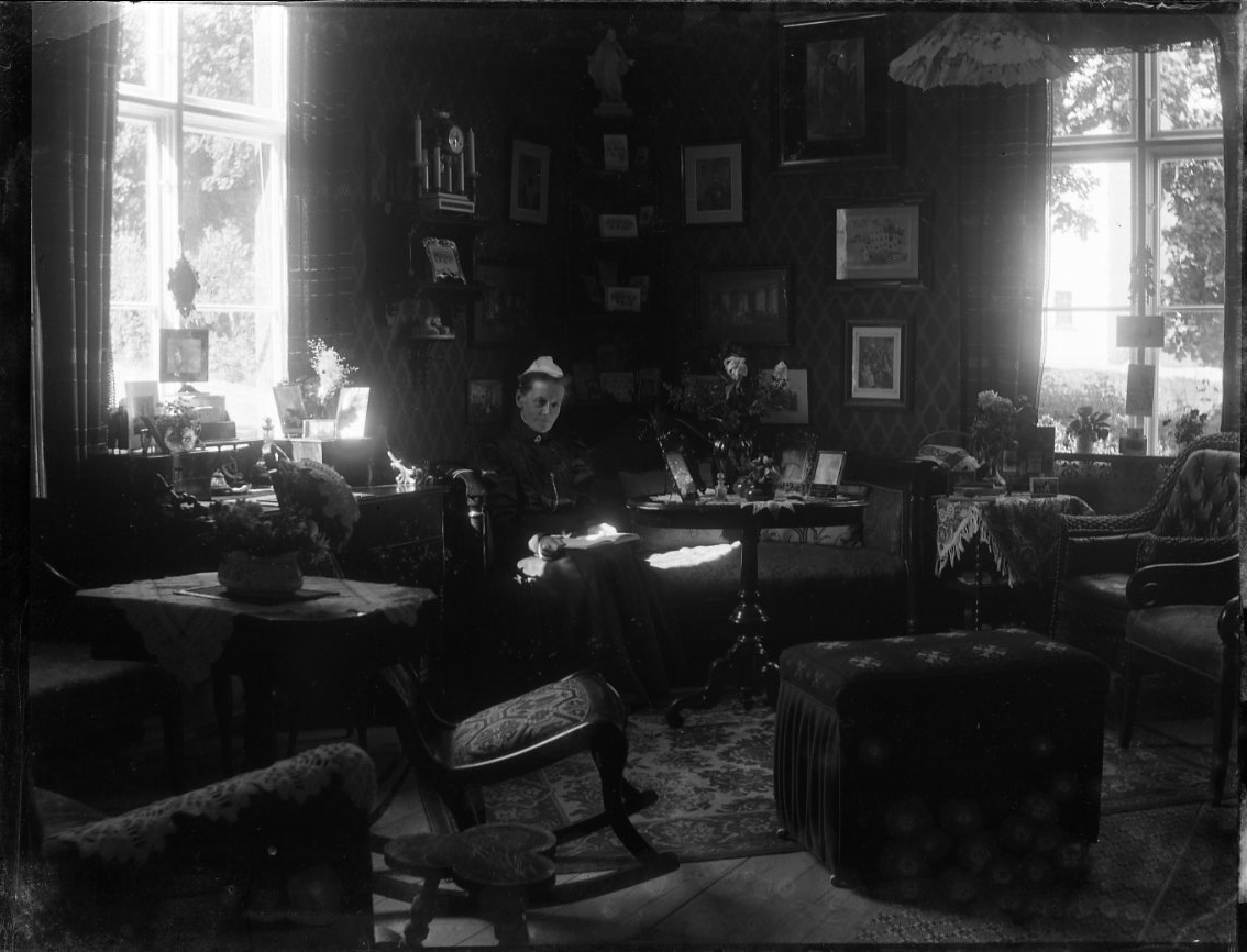 Interiör hos Fanny von Otter, som sitter i en soffa vid ett bord. Hon är i rummet mot nordost, mot kyrkan.