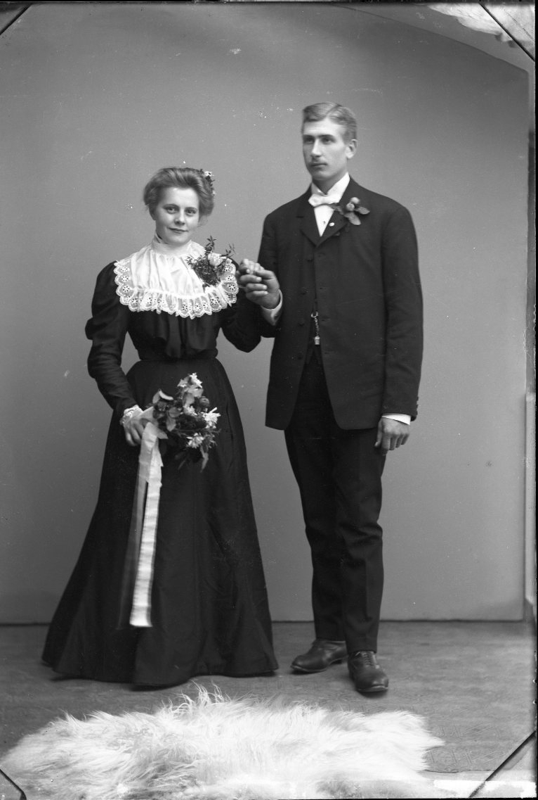 Ett brudpar. Kvinnan i mörk klänning utan krona. De håller varandras hand.