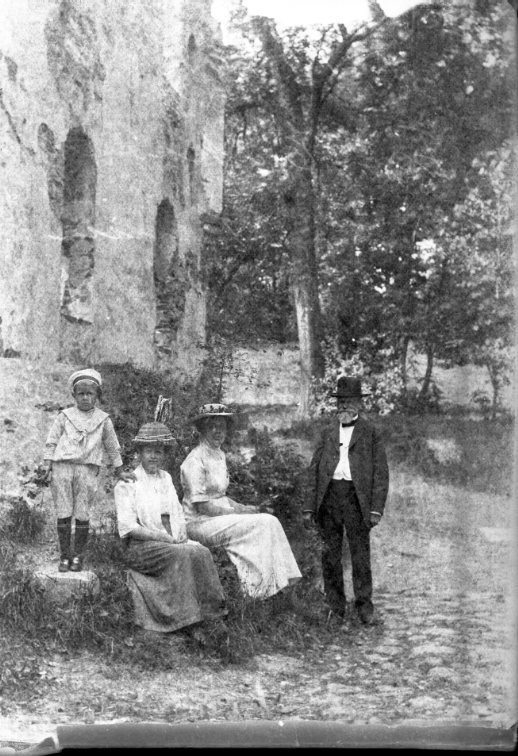 Ett sällskap på Visingsborgs slottsruins inre borggård. En äldre man med vitt skägg och hatt står intill två kvinnor som sitter på en stenhäll. En liten pojke i sjömanskostym står på hällen till vänster om kvinnorna, han har möjligen en leksak i höger hand.