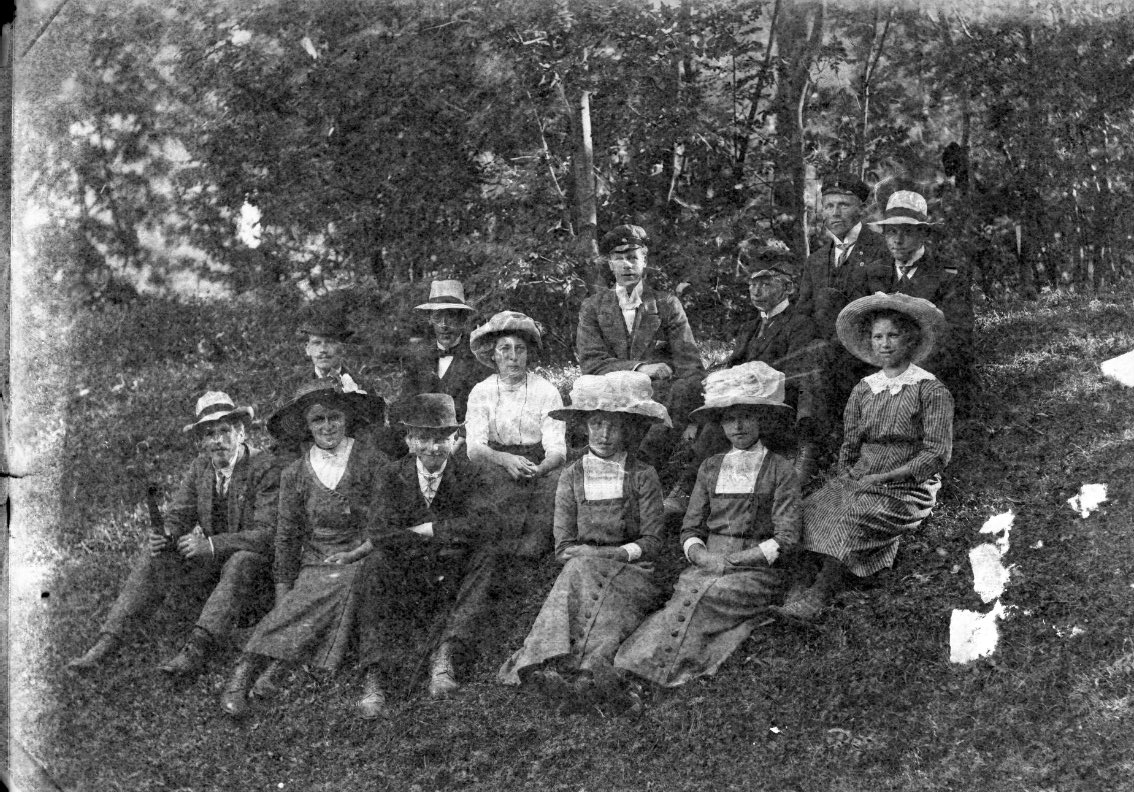 Tretton unga kvinnor och män sitter i en grässlänt, sannolikt i närheten av Visingsborgs slottsruin.