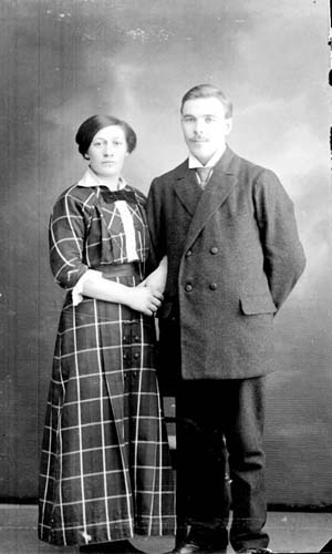 En man och en kvinna står armkrok med varandra. Kvinnan har en lång storrutig klänning. Förmodligen ett par.
