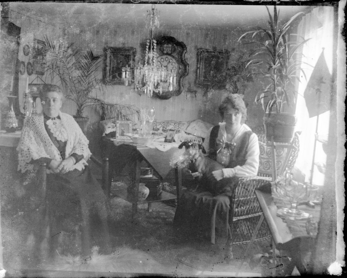 Två kvinnor i en hemmiljö. Lågt i tak med kristallkrona över ett bord. Väggklocka mellan porträtt. En äldre kvinna sitter i en munkstol och en yngre, med tax i knät, i en korgstol.