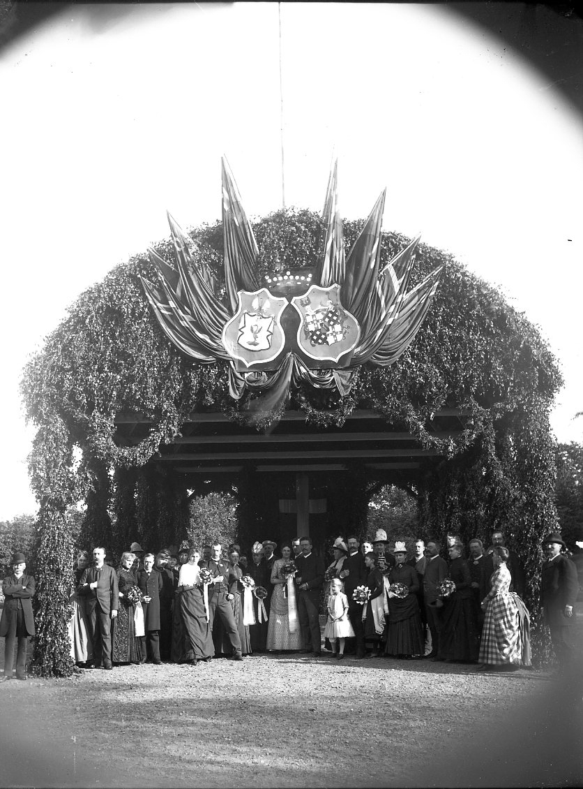 Folksamling under en stor lövad portal med två vapensköldar, den vänstra tillhörande Gyllensvaan och den högra von Otter. Sannolikt i samband med ett bröllop. Mannen i mitten (brudgummen?) är möjligen hovrättsrådet Erik Gyllensvaan.