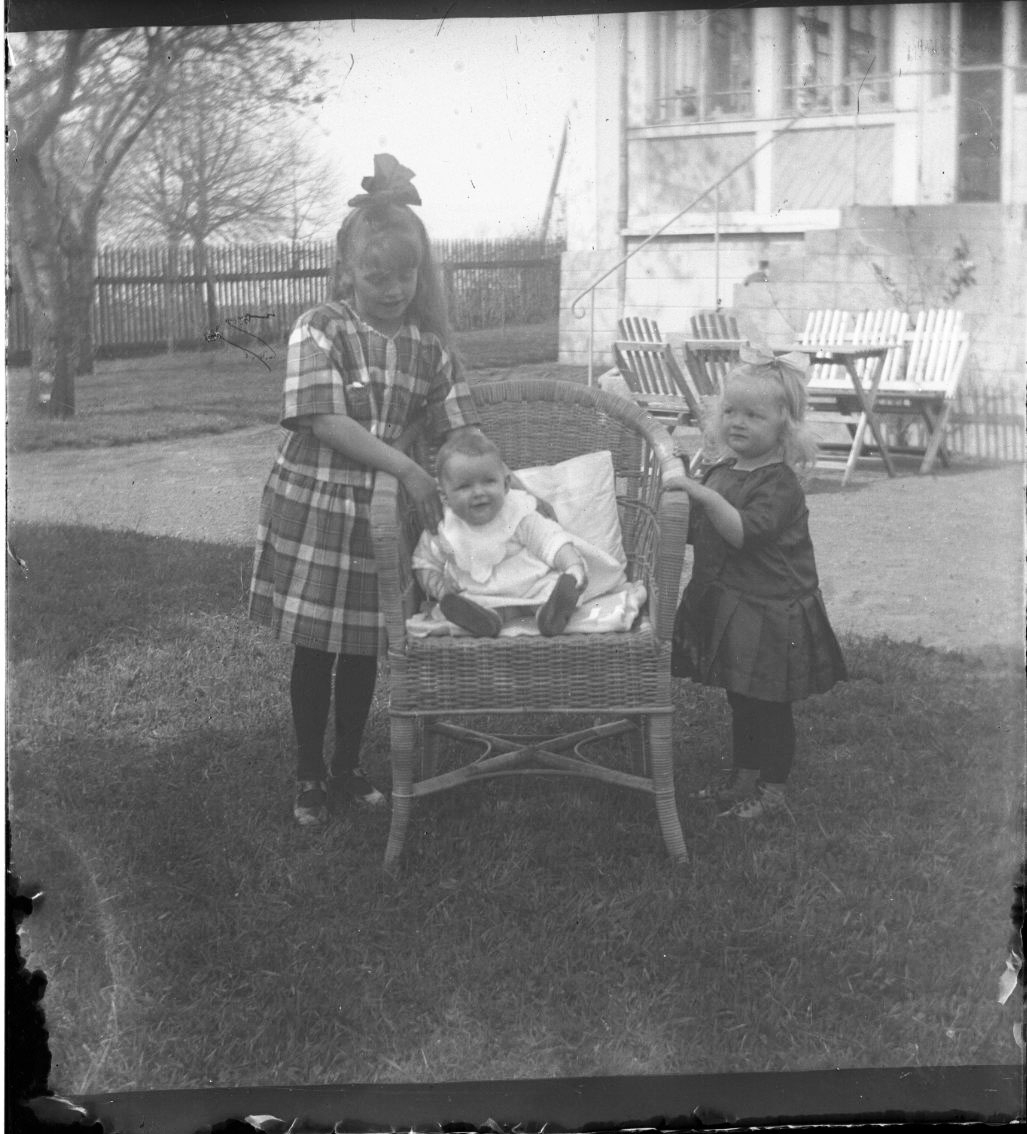En trädgård, möjligen till Hamnvägen 3. På gräsmattan står en korgstol där det sitter ett spädbarn. En flicka med rosett i håret och rutig klänning står till vänster och balanserar barnet. Till höger står en yngre flicka i mörk klänning och rosett även hon och tittar på.