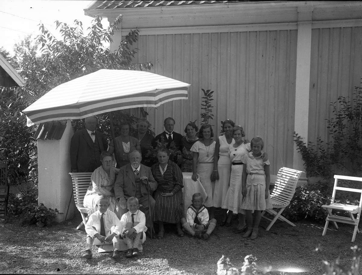 En grupp kvinnor, män och barn står respektive sitter i trädgårdsmöbler under ett parasoll. Det är herr och fru Oldenburg med barn och barnbarn.