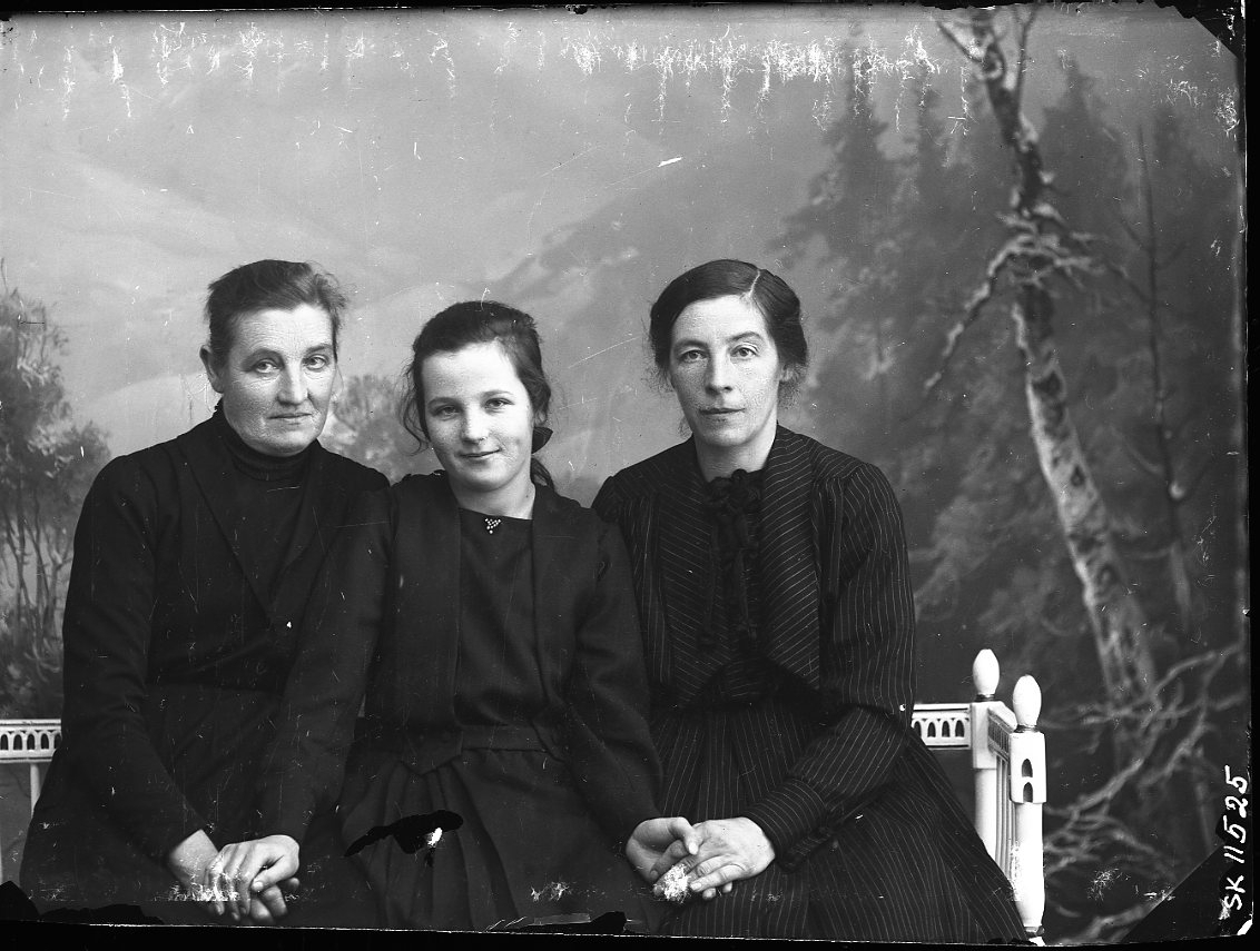 Två kvinnor och en flicka sitter tätt ihop på en soffa. De håller varandras händer. Troligen Anna Karlsson till vänster, dottern Greta samt Elin Hermansson.
