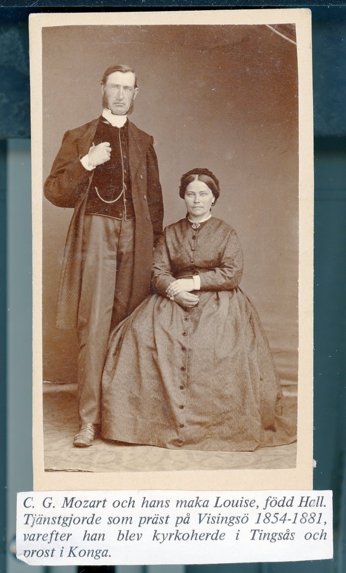 Kabinettsfotografi: Prosten Carl Gustaf Mozart i helfigur stående bredvid hustrun Louise som sitter på en stol.