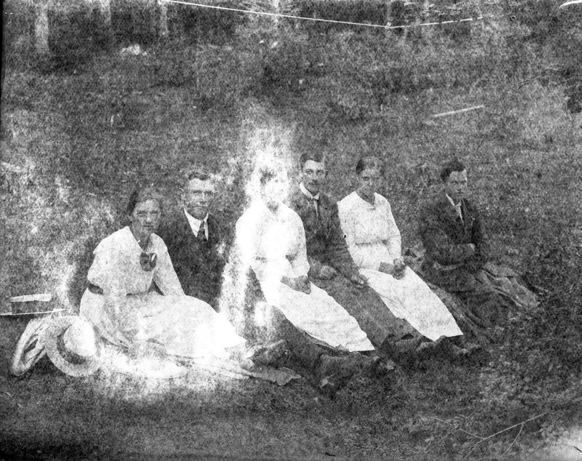 Tre kvinnor och tre män sitter på en slänt, de har lagt hattarna intill sig.