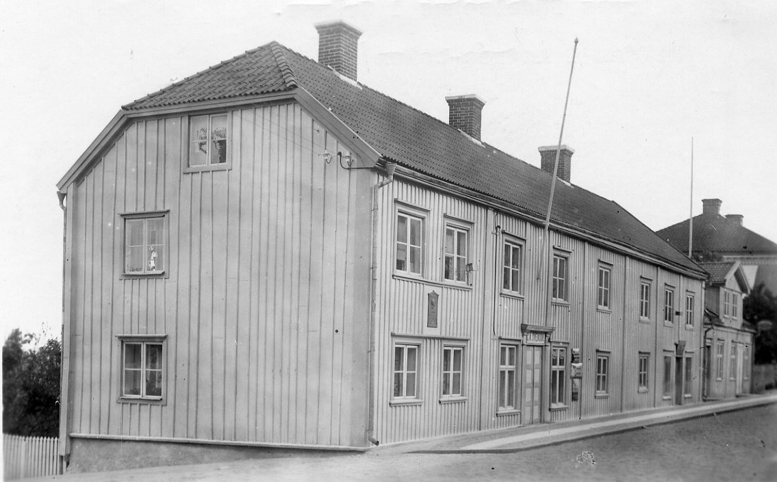 Brahegatan 37 i Gränna. En tvåvåningsbyggnad med locklistpanel och valmade gavlar. En fasadflaggstång ovanför port med skylt "C. A. Svensson", en speceri- och divershandel.