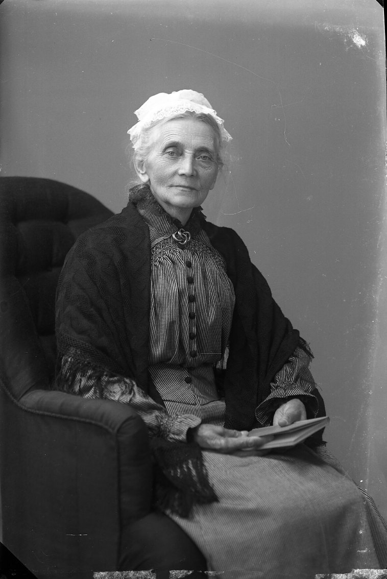 Porträtt av en kvinna som sitter i en fåtölj med en bok i knät. Hon bär en mörk virkad sjal och en tunn ljus mössa.