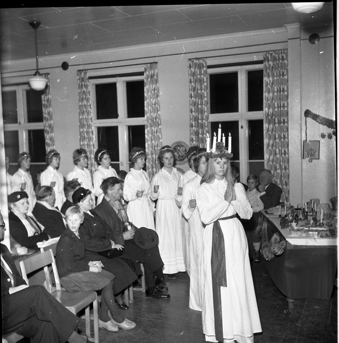 Gränna scoutgårds luciatåg i okänd lokal. Barn och vuxna sitter på bänkar och tittar på.
