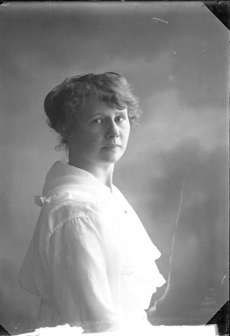 Porträtt av en kvinna. Hon sitter i profil och vänder huvudet mot fotografen.