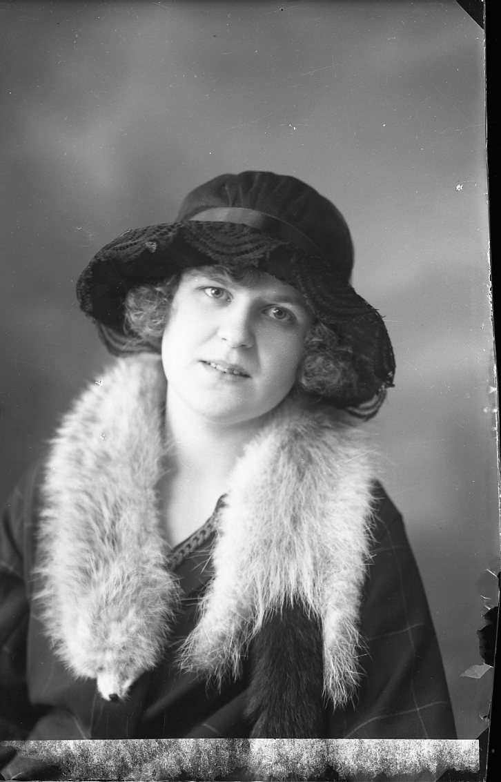 Porträtt av en ung kvinna med hatt boa runt halsen.
