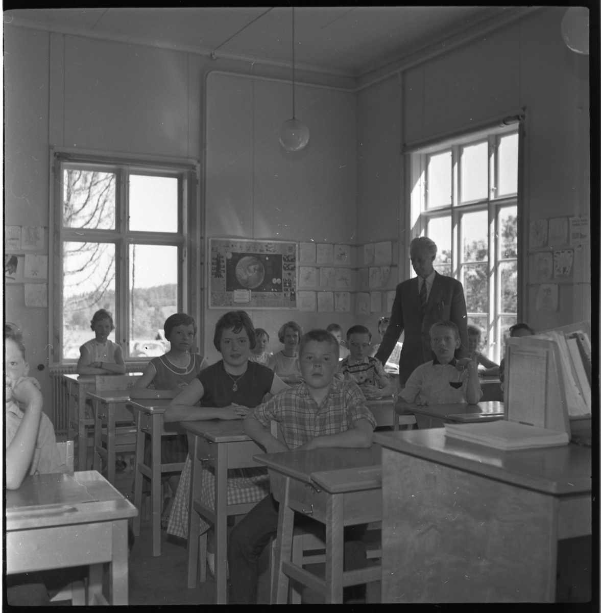 Skolelever sitter i sina bänkar, de tittar in i kamerna. På väggen bakom dem hänger teckningar och en planch med en planet på. Läraren står och iaktar eleverna.