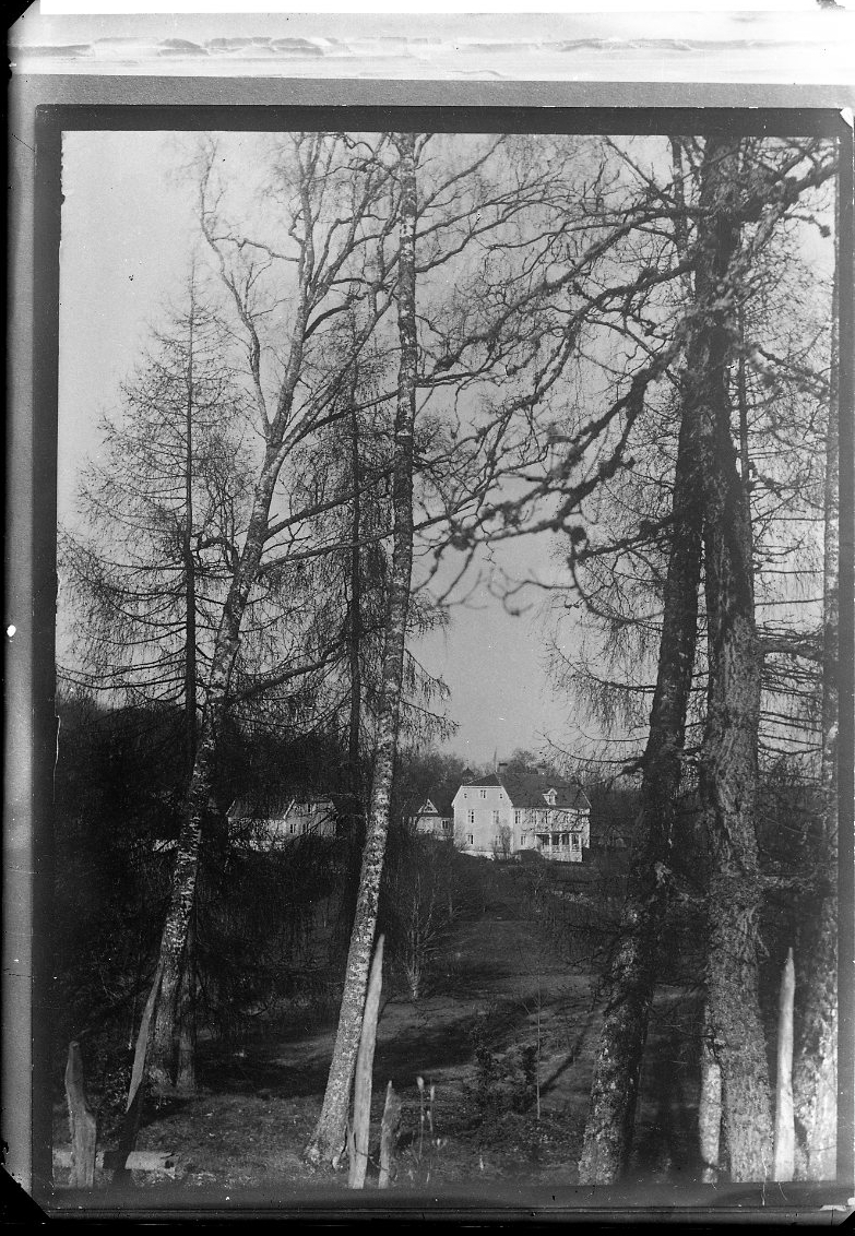 Reprofotografi. Bortom några träd skymtar en herrgårdsliknande byggnad med två flyglar.
