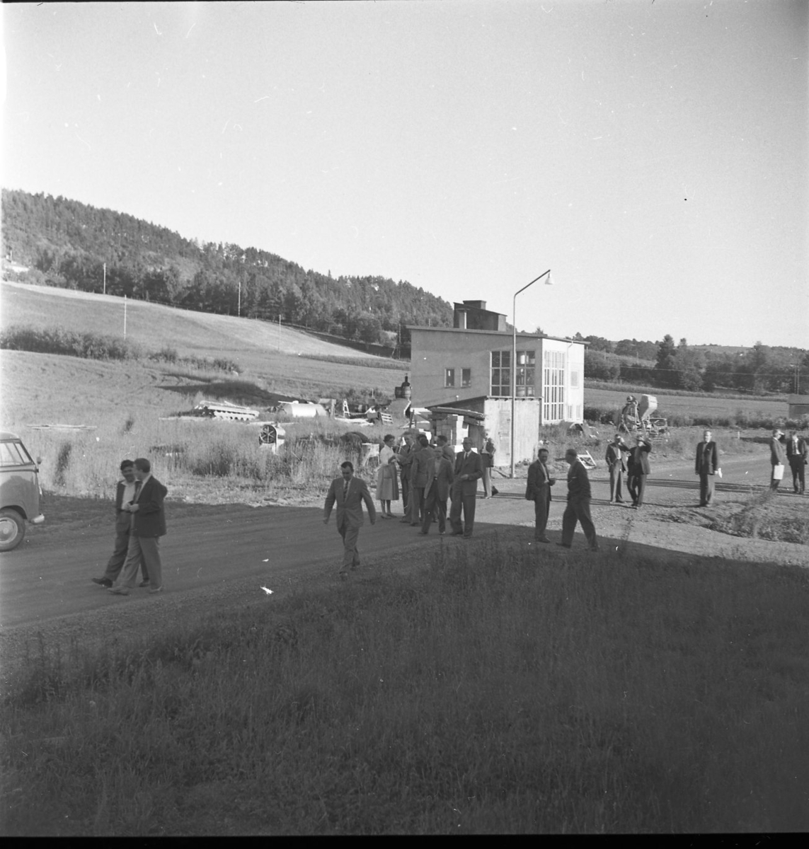Bilden föreställer en grusväg. I bakgrunden syns ett stort fält med skog bakom. Längst med vägen står en byggnad. På vägen står det herrar.