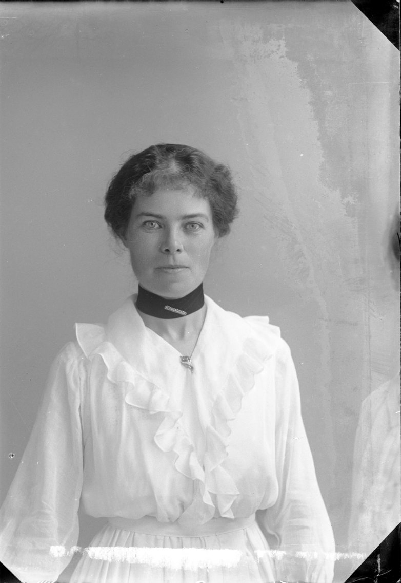 Porträtt av en kvinna i ljus klänning med mörkt band runt halsen.