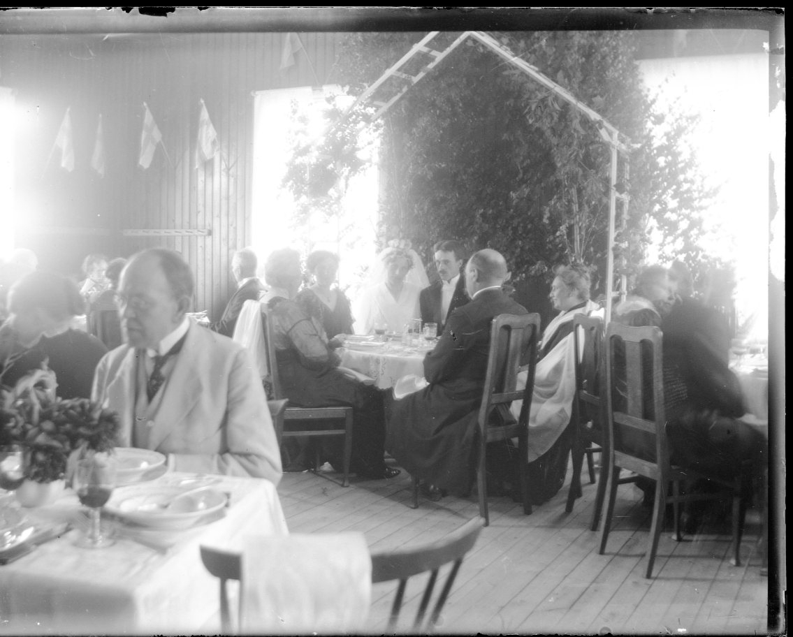 Bröllopsgäster vid matbord. Brudparet sitter i centrum under portal med björkris.