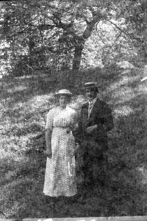 En man och en kvinna i hatt står på en skuggig gräsplan.