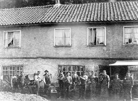 Arbetare framför vagnsmedjan till en vagnfabrik, med släggor och andra verktyg i nävarna.