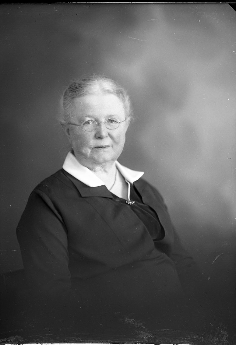 Porträtt av fru Carlstedt i Gränna, en äldre kvinna med glasögon.
