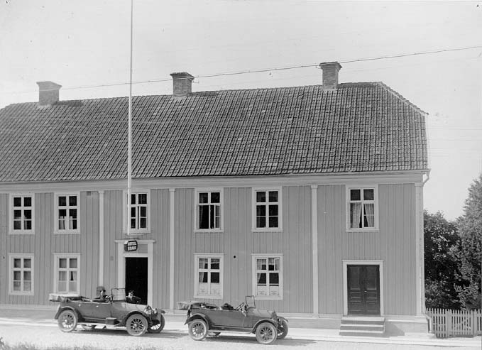 Hotell Brahe vid Brahegatan i Gränna. Två bilar med suffletten nedfälld står parkerade utanför. Två män i chaufförsuniform står lutade mot en den ena bilen. Bilen till vänster är en Buick från cirka 1919, och bilen till höger är en Overland, också den från cirka 1919. Båda två ser ut att vara droskbilar (taxameter vid framrutan bredvid föraren)."