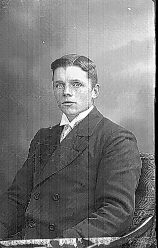 Titel: Bröstbild av en ung man som sitter in en fåtölj.