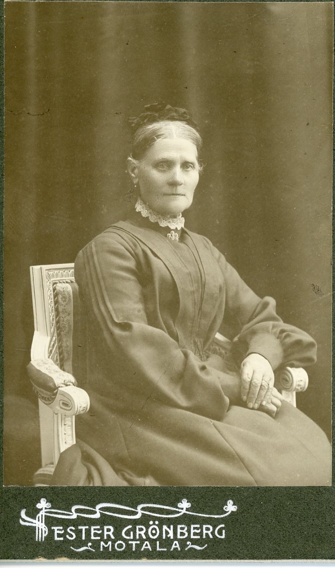 Kabinettsfotografi av en äldre kvinna som sitter på en stol.
