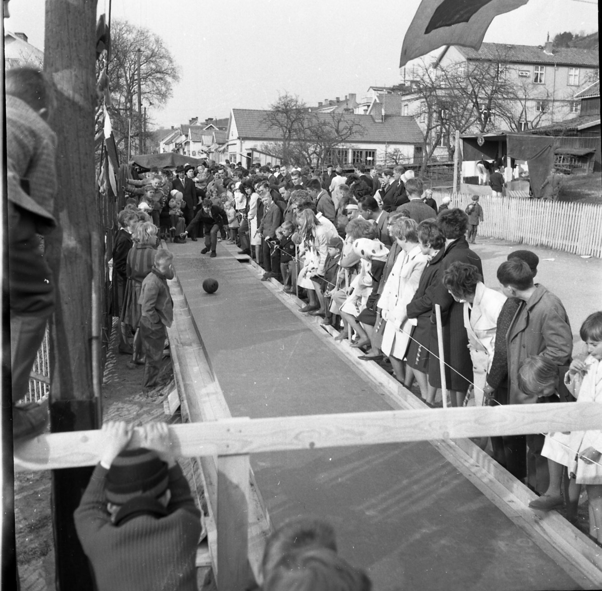 Bowling på en provisorisk bana på Sjögatan. En stor folksamling tittar på.