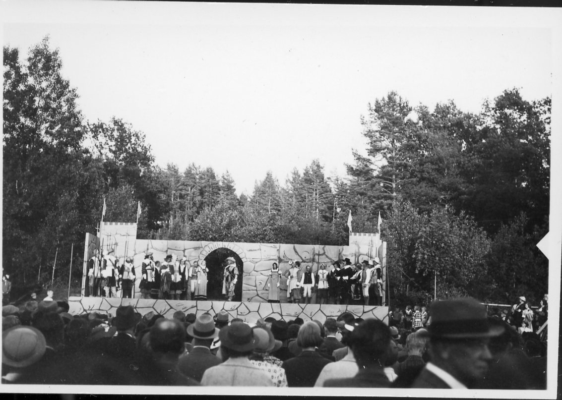 Amatörskådespelare på en scen med scenografi förställande en borg. En stor publik i förgrunden.