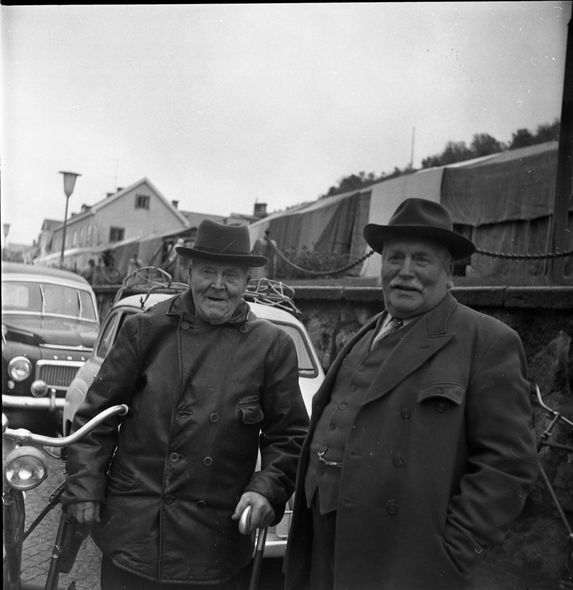 Två äldre män med och skinnjacka respektive rock står på Brahegatan nedanför torgmuren. Till vänster med käpp i handen står Theodor "i Sånghem" Johansson och till höger David Karlsson. På torget ser det ut att vara marknadstält.