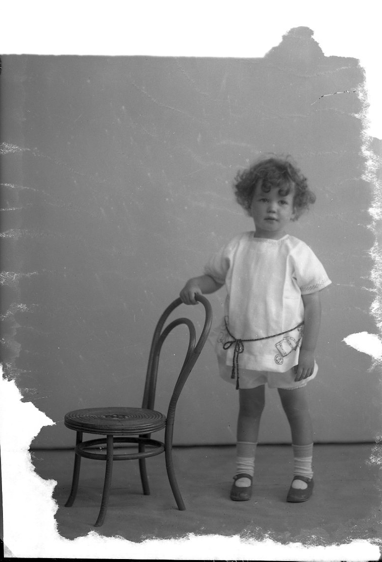 Porträtt av en liten lockhårig pojke som står med handen på en liten stol.