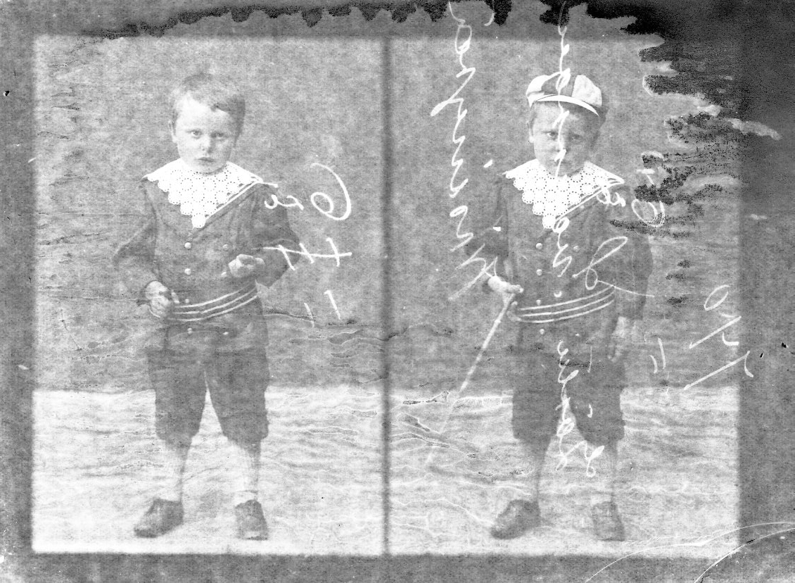 Två porträtt av en liten pojke på en glasplåt. På ena bilden har han en mössa på sig.