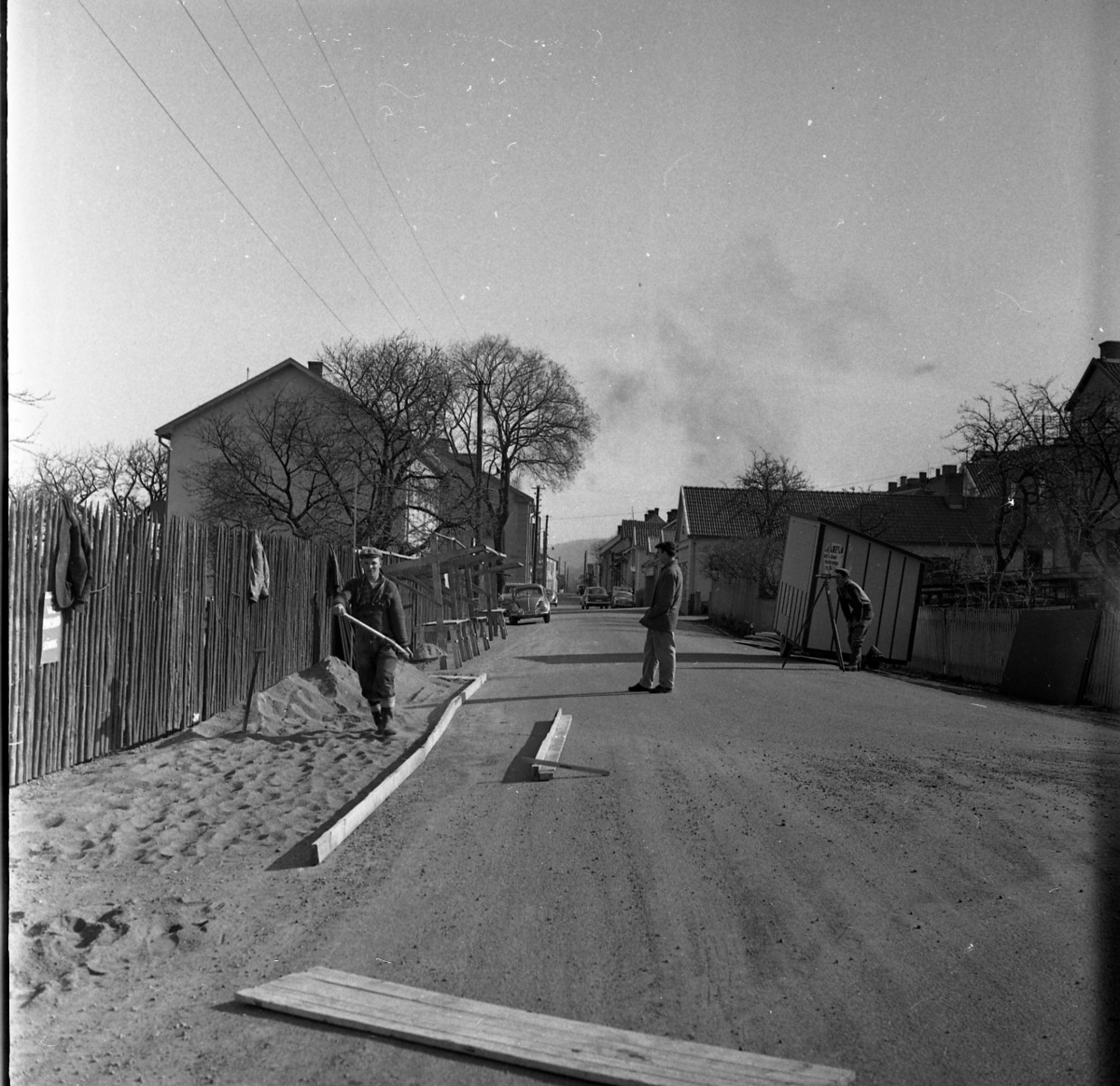 Män arbetar på Sjögatans södra del inför Gränna Lions marknad. Till höger i bild står en man vid ett nivelleringsinstrument.