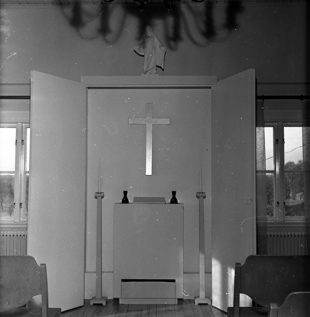 Ett altare med en Jesus-statyett ovanpå. Det är fönster på varje sida av altaret. Det hänger ett trumfkrucifix i silver ovanför altaret.
