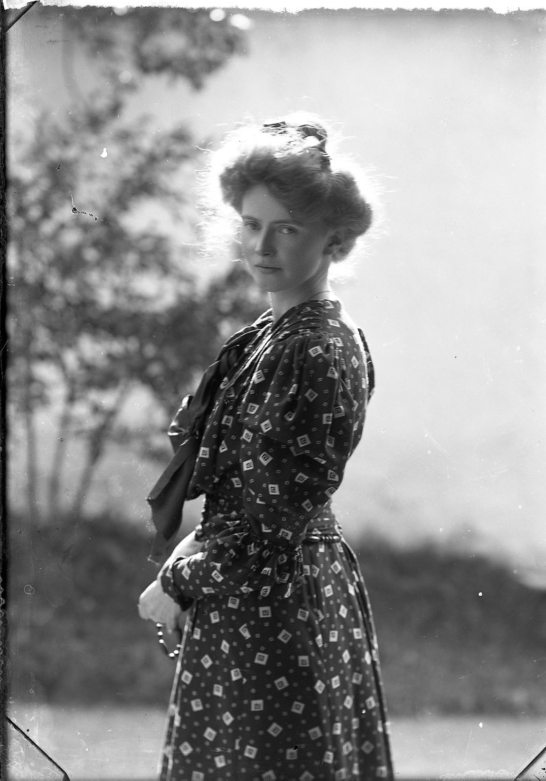 Porträtt av okänd ung kvinna i mönstrad klänning. Hon är möjligen fotografen Ester Grönberg.