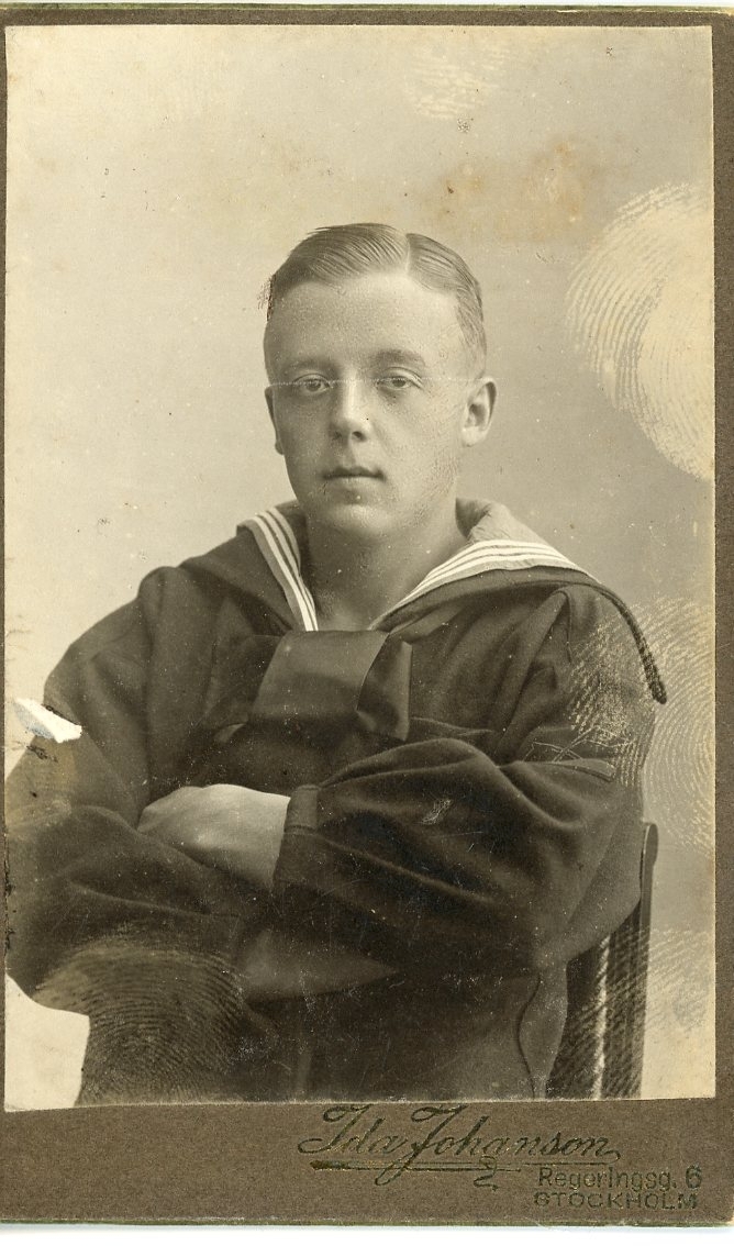 Kabinettsfotografi av en ung man i flottans uniform. Han sitter med armarna i kors.
