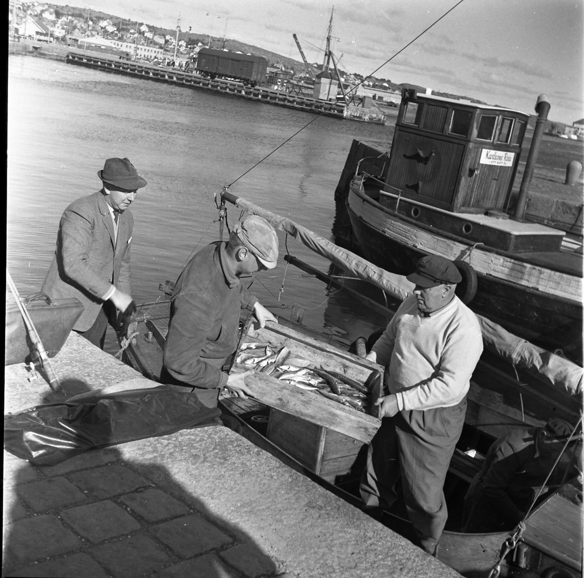 En inombordare ligger vid kaj. En låda med fisk lyfts upp ur båten av två män. På kajen ligger ett kastspö över en portfölj.