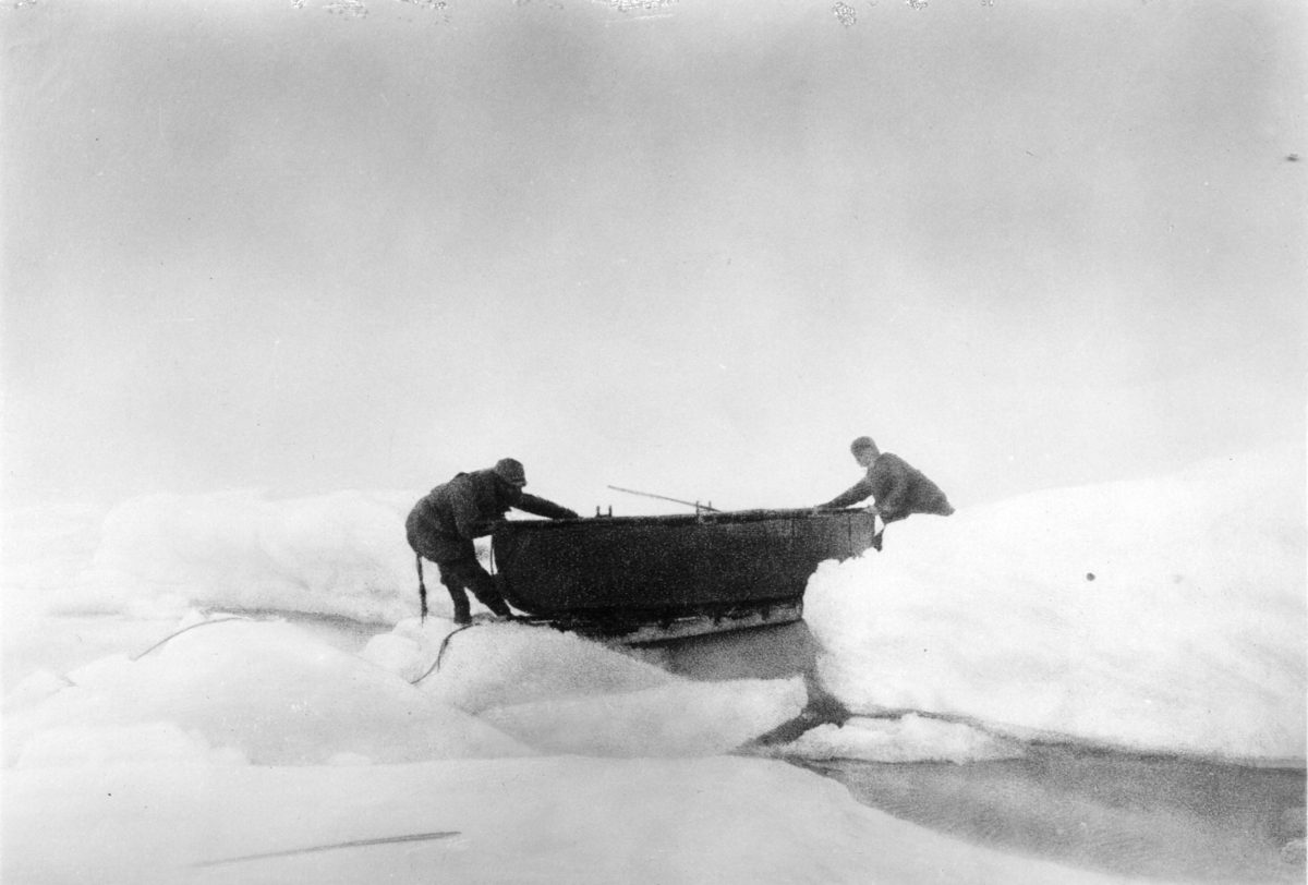 Isvandringen. Båten på en släde skjuts över ett mindre vattendrag. K Fraenkel till vänster och S A Andrée till höger. Retuscherad version av gm.III-83