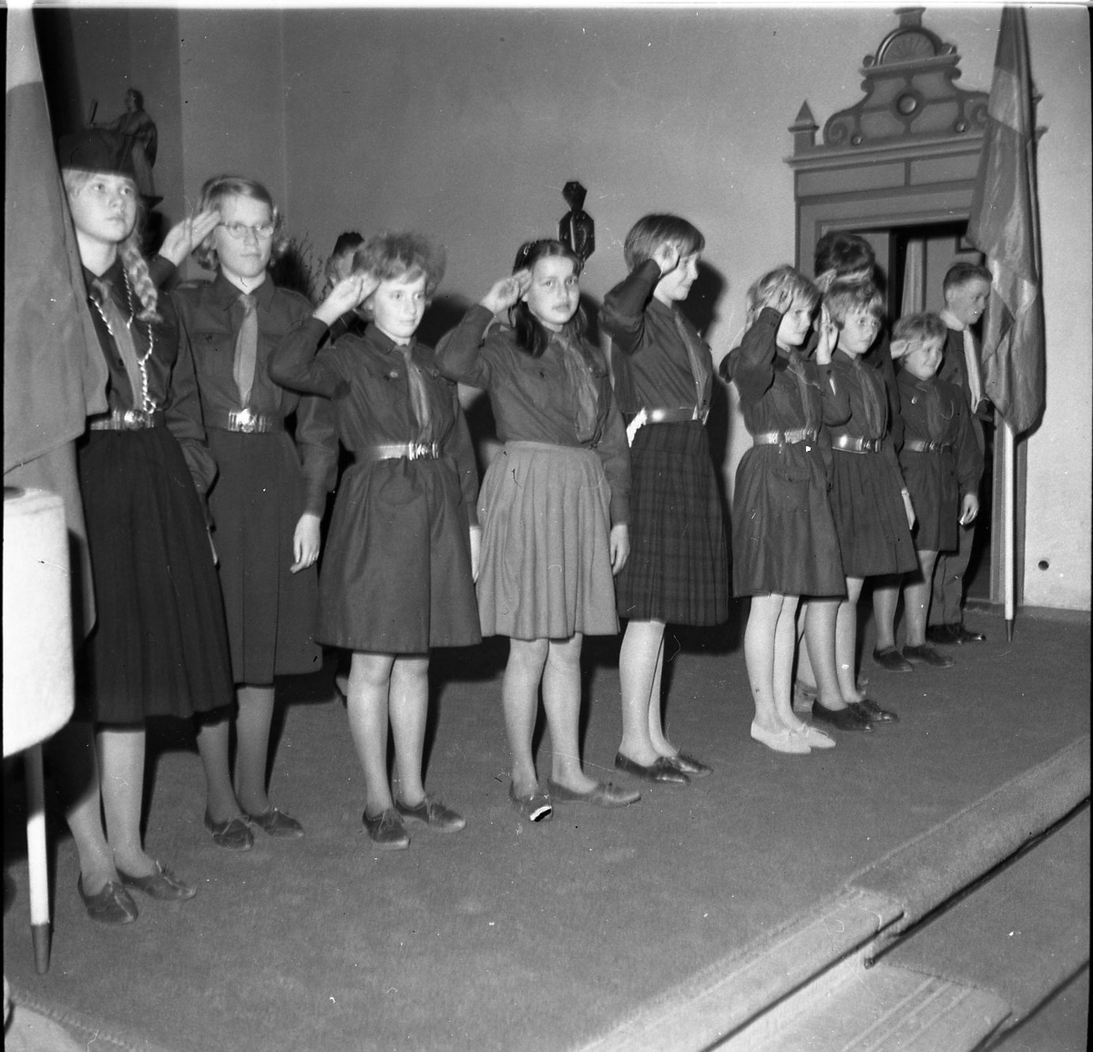 Unga kvinnliga scouter står på rad och gör honnör. De befinner sig i en kyrka.