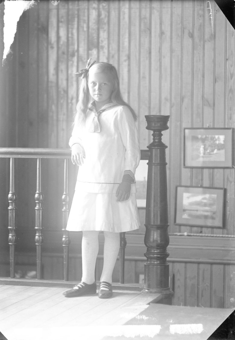 En liten flicka i sjömansklänning och rosett i håret står vid ett trappräcke i ett trapphus.