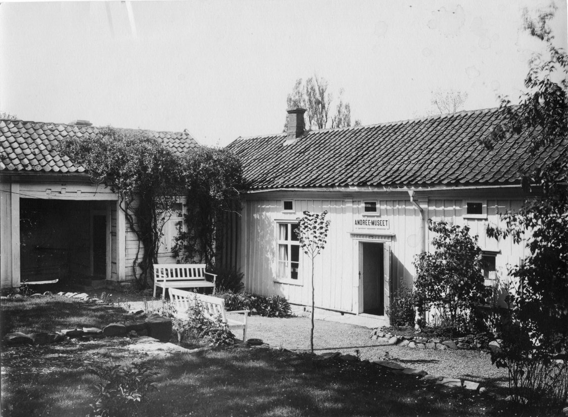 Gårdsmiljö från kv Hjorten 3 i Gränna med Andréemuseet. Framför entrén till museet står två vita trädgårdssoffor. I centrum en liten späd lind som planterades vid museets öppnande den 3 maj 1931.